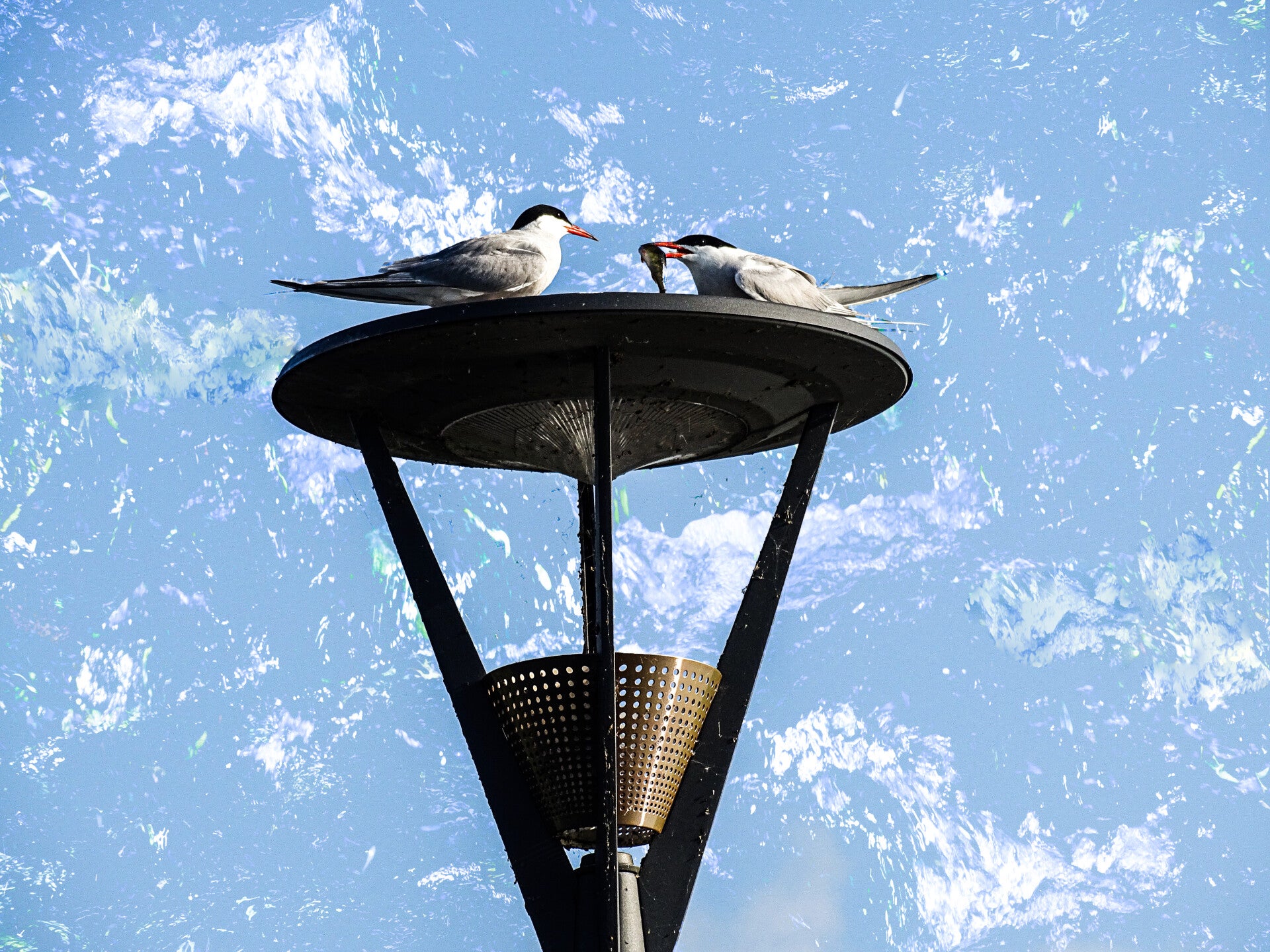 Picture shot in Lithuania Birzai(2020) I was on a trip with my mom and dad. We drove there to enjoy the sights and warm summer breeze. I noticed a lot of birds on each lamp. This couple of birds were fishing and I kept my eyes on them the whole time. I prepared my camera and got this picture in action. There were no clouds, just blue sky. So I added in abstract visuals to the background.
